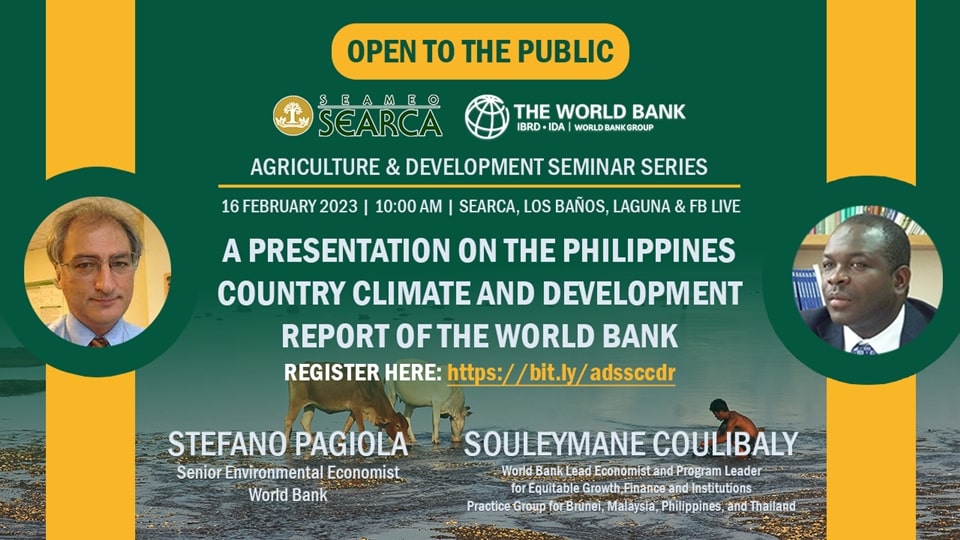 Policy action and investments as well as the tools and instruments needed to substantially reduce damages caused by climate change will be discussed at the presentation of the World Bank’s Philippines Country Climate and Development Report (CCDR) at the Agriculture and Development Seminar Series (ADSS) of the Southeast Asian Regional Center for Graduate Study and Research in Agriculture (SEARCA) on 16 February 2023.