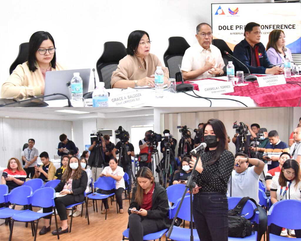 The Department of Labor and Employment (DOLE) continues to provide timely and relevant information on the country’s current labor and employment situation as it holds its first press conference with its media partners this year at the DOLE Central Office in Intramuros, Manila on February 8, 2024. Led by DOLE Secretary Bienvenido E. Laguesma (center, top photo), the press conference provided a platform for DOLE to discuss the Labor Force Survey December 2023 results, the proposed P100 wage hike nationwide, employment generation measures, and the assistance to workers affected by the El Niño phenomenon and the recent calamity in Davao and Caraga regions. Secretary Laguesma was joined by (from right to left) National Wages and Productivity Commission Executive Director Ma. Criselda R. Sy; Labor Relations, Policy and International Affairs Cluster and Regional Operations Cluster Undersecretary Benedicto Ernesto R. Bitonio Jr.; Employment and Human Resource Development Cluster Undersecretary Carmela I. Torres, and Bureau of Local Employment Labor Market Information Division chief Grace Baldoza. “Ang DOLE ay nagpapasalamat at natutuwa sa pinakahuling ulat ng ating Philippine Statistics Authority na nagpapakita ng isang mataas na employment rate,” said the secretary. “Ang nasabing resulta ay nagbibigay sa DOLE ng lakas at inspirasyon upang higit pang pag-ibayuhin ang amin pong implementasyon ng programa ng DOLE na sa tingin ay contributory o nakakatulong sa pagtaas ng bilang ng mga may trabaho,” he added. (Photos by Alejandro P. Echavez, DOLE-IPS)