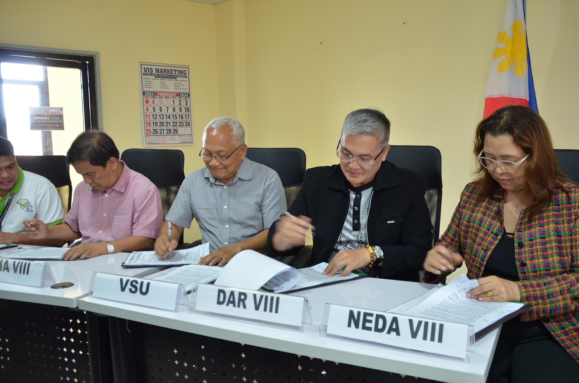 Bilang kilos ng suporta, si DAR Regional Director Robert Anthony Yu kasama ang mga kinatawan mula sa Department of Agriculture (DA), National Food Authority (NFA), Department of Social Welfare and Development (DSWD), Technical Education and Skill Development Authority (TESDA) , Department of Labor and Employment (DOLE), Commission on Higher Education (CHED), Department of Health (DOH), National Irrigation Authority (NIA), National Economic Development Authority (NEDA), Visayas State University (VSU), Philippine Rice Research Nilagdaan ng Institute (PhilRice), Philippine Center for Postharvest Development and Mechanization (PhilMech), BPI, Tingog Partylist at Office of the House Speaker, ang Memorandum of Understanding (MOU) noong Miyerkules ng hapon sa NEDA Regional Office sa Palo, Leyte.