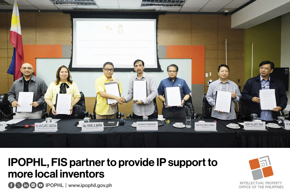 Lumagda sina IPOPHL Director General (DG) Rowel S. Barba at FIS President Dr. Ronald P. Pagsanghan sa tanggapan ng IPOPHL sa Taguig City noong nakaraang linggo ng isang memorandum of understanding (MOU) kasama ang Filipino Inventors Society (FIS) upang matulungan ang mga imbentor na protektahan ang kanilang intelektwal na ari-arian (IP) at higit na kumilos sa komersyalisasyon ng kanilang mga teknolohiya dito at sa ibang bansa. Magkatuwang nilang susuportahan ang mga pagsusumikap ng isa’t isa tungo sa pagtataas ng innovation scene ng bansa.