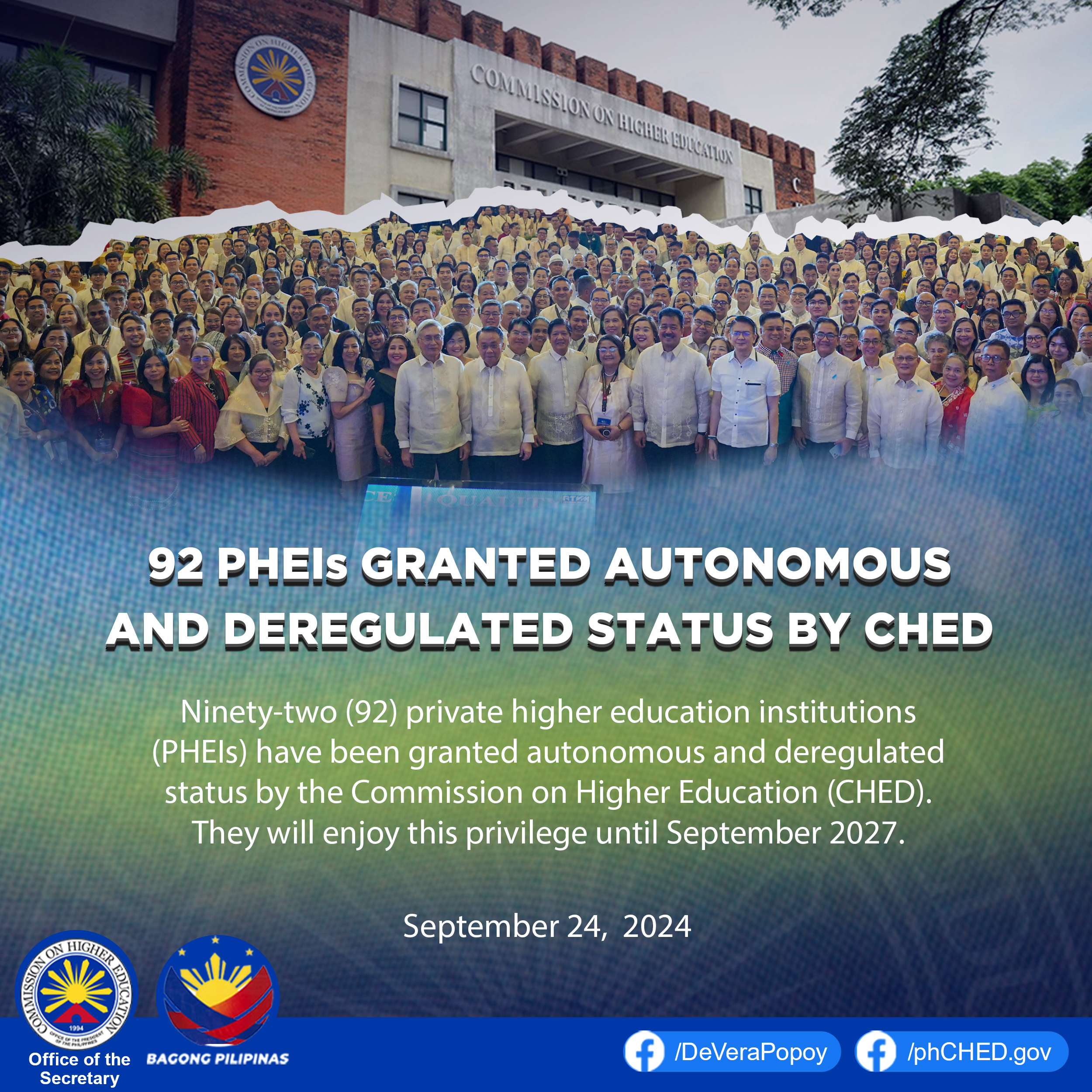 Nabigyan ng autonomous at deregulated status ng Commission on Higher Education (CHED) ang siyamnapu’t dalawang (92) private higher education institutions (PHEIs). Tatangkilikin nila ang pribilehiyong ito hanggang Setyembre 2027.