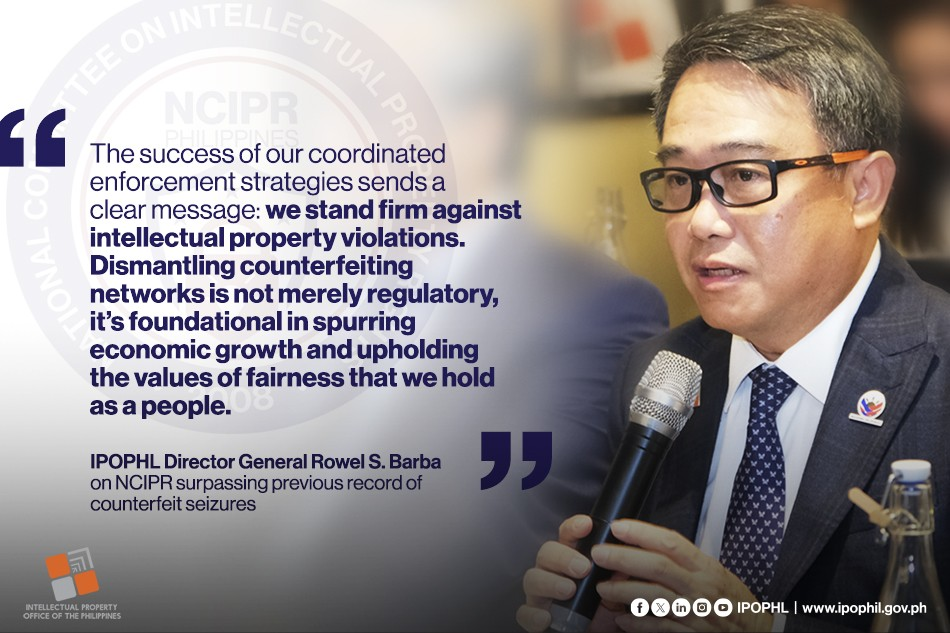 Sa unang siyam na buwan ng 2024, ang tinatayang market value ng intellectual property (IP) infringing goods na nasamsam ng NCIPR ay umabot sa tumataginting na P35.24 bilyon, na lumampas sa dating record na P26.89 bilyon noong 2023.