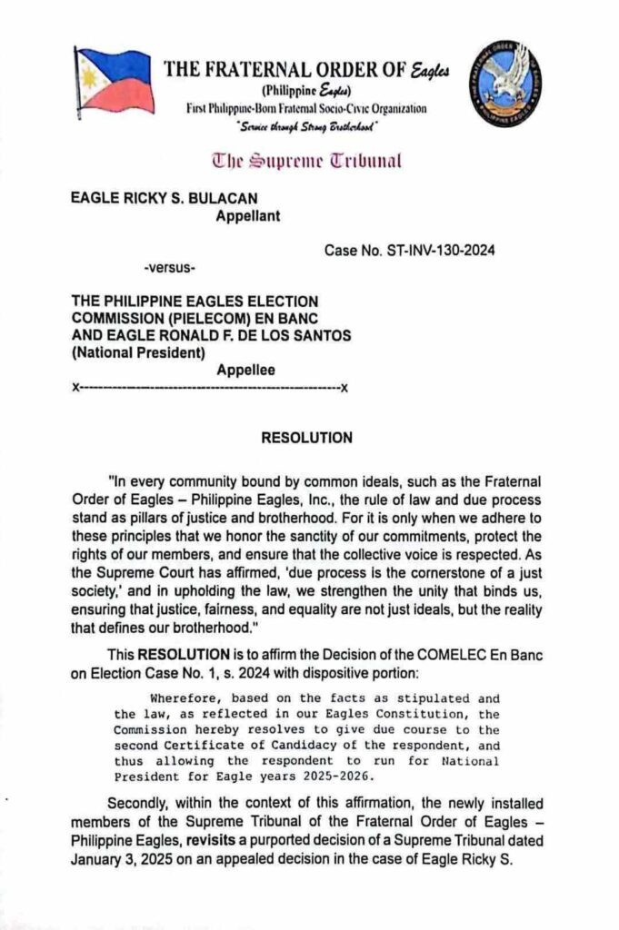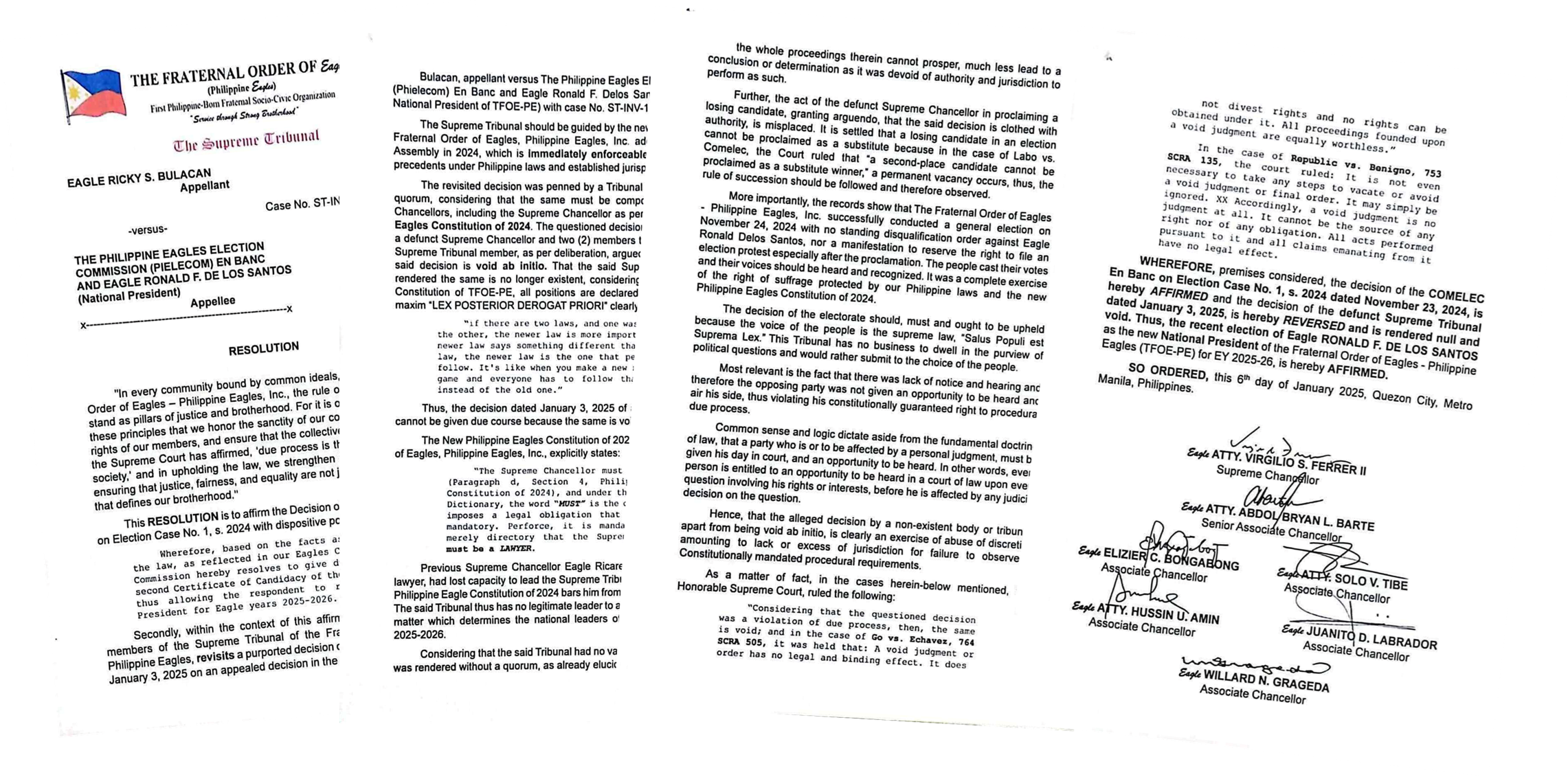 The resolution, dated January 6, 2025, resolves a tumultuous internal conflict that pitted the organization’s election body and its newly elected president against appellant Eagle Ricky S. Bulacan.