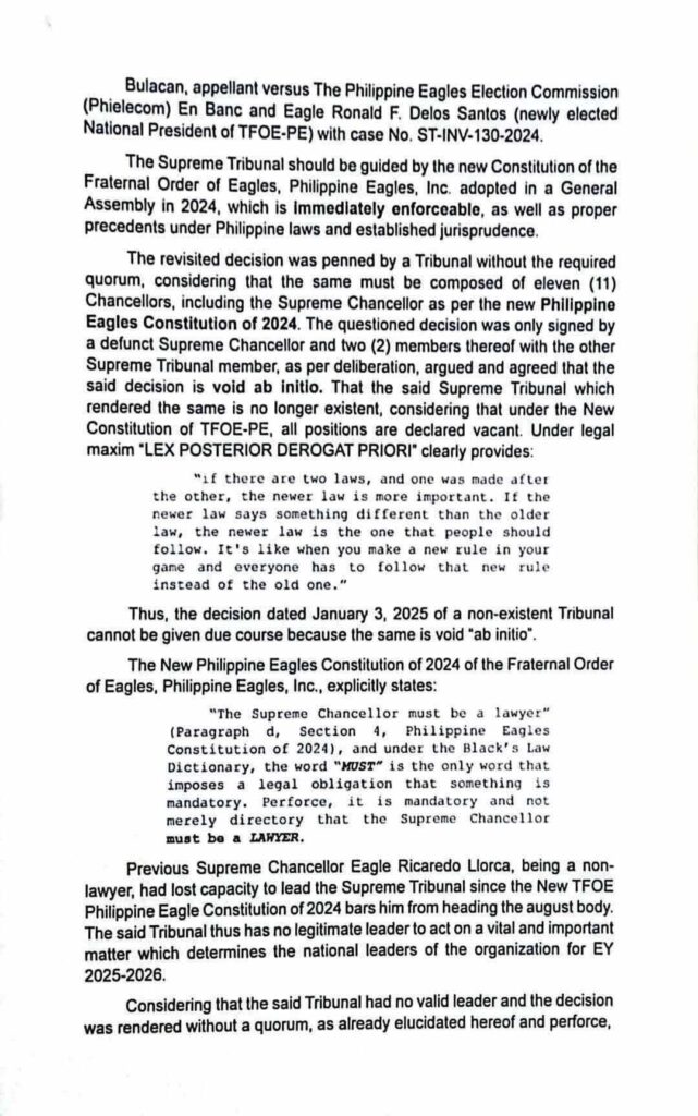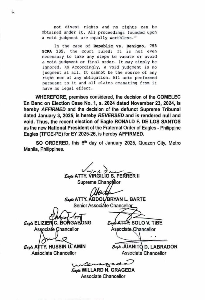 QUEZON CITY, METRO MANILA – JANUARY 6, 2025 – In a decisive ruling that reinforces the primacy of its new constitution and the will of its members, the Supreme Tribunal of the Fraternal Order of Eagles – Philippine Eagles, Inc. (TFOE-PE) has affirmed the election of Eagle Ronald F. De Los Santos as the organization’s National President for the 2025-2026 term, effectively quashing a previous, controversial decision that had sought to overturn the election results.