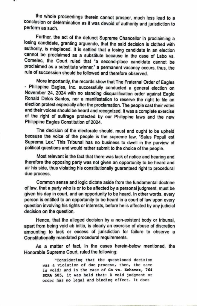 - AFFIRMED the November 23, 2024, decision of the Philippine Eagles Election Commission (Phielecom) En Banc, which had given due course to De Los Santos’ certificate of candidacy.