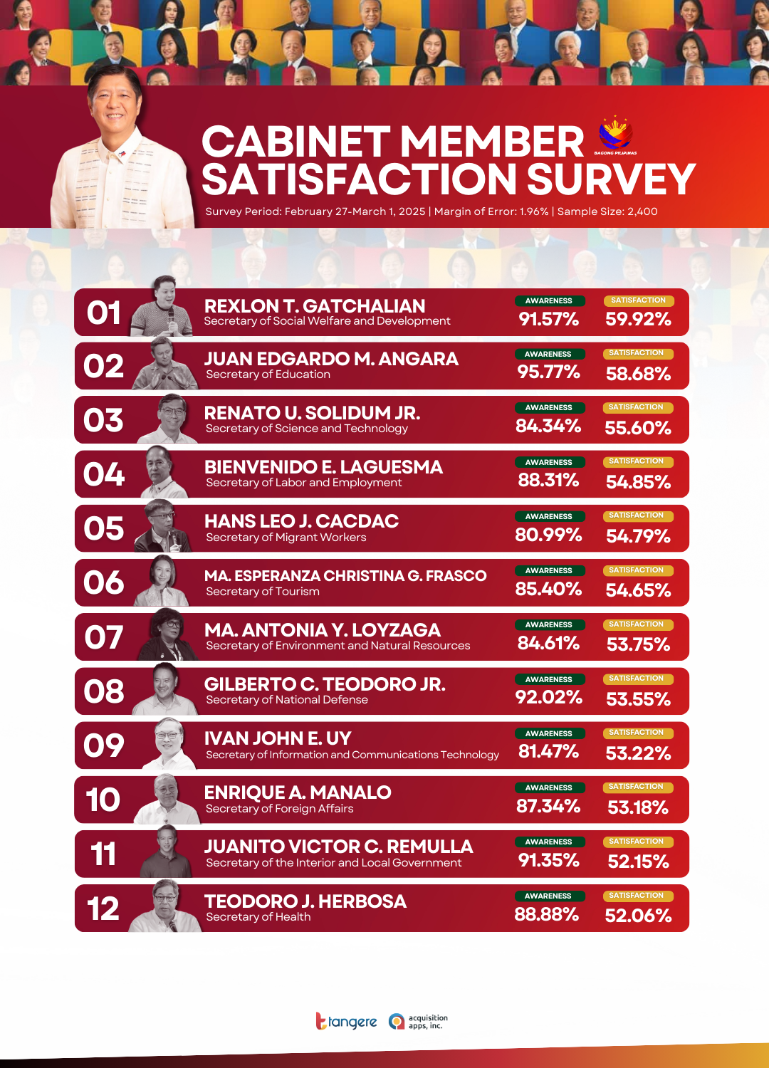 Lumabas bilang pinakamataas na rated na kalihim ng gabinete sa ilalim ng Administrasyong Marcos si Department of Social Welfare and Development (DSWD) Secretary Rexlon Gatchalian, ayon sa pinakabagong survey na isinagawa ng Tangere. Batay sa survey na isinagawa mula Pebrero 27 hanggang Marso 1, 2025, nakakuha si Gatchalian ng 59.92% na satisfaction rating, na siyang pinakamataas sa hanay ng mga opisyal ng administrasyon.