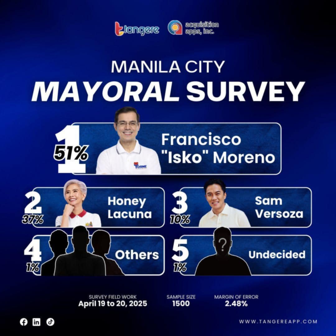 Nangunguna si dating Mayor ng Maynila Isko Moreno Domagoso sa 2025 Tangere City of Manila Mayoral Preferential Survey ilang linggo bago ang halalan sa kalagitnaan ng taon ngayong 2025 na may 51% na boto mula sa mga respondent. Kasunod niya si kasalukuyang Mayor Dra. Honey Lacuna na may 37% na suporta. Pumangatlo si Sam Versoza na kinatawan ng Tutok to Win Party-list na may 10% na boto. Ang ibang mga kandidato ay may pinagsamang 1% na boto. Tanging 1% lamang ng mga rehistradong botante sa Lungsod ng Maynila ang hindi pa nakakapagdesisyon.