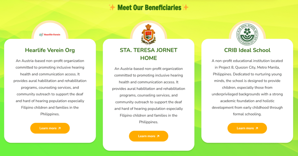 • Sta. Teresa Jornet Home & Hearlife Verein Org: Austria-based organizations committed to promoting inclusive hearing health. They provide vital habilitation, rehabilitation, and community outreach programs, with a special focus on supporting deaf and hard-of-hearing Filipino children and their families.