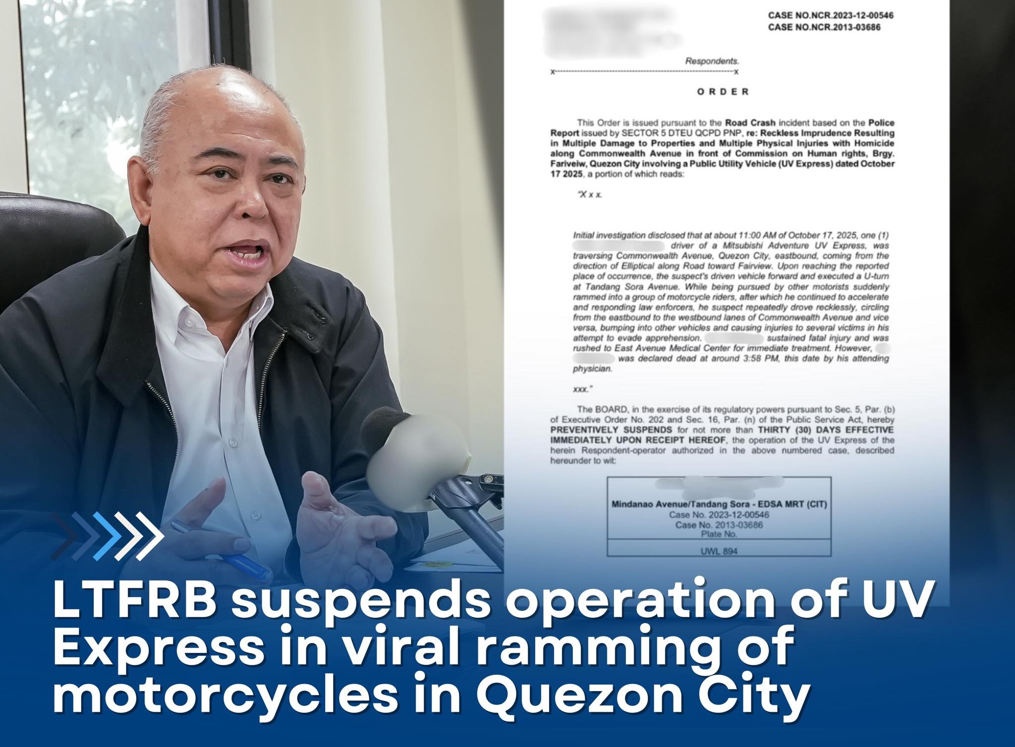 Mahigpit na sinuspinde ng Land Transportation Franchising and Regulatory Board (LTFRB) ang operasyon ng isang UV Express na sangkot sa isang nakamatay at sunud-sunod na pagbangga sa Commonwealth Avenue, Lungsod Quezon noong Biyernes, Oktubre 17.
