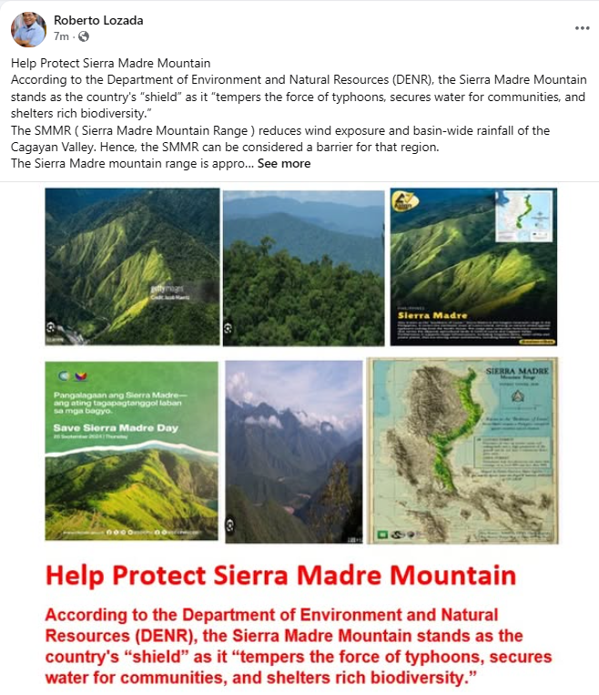 Citing data from the Department of Environment and Natural Resources (DENR), Engr. Roberto Lozada’s post highlights that the Sierra Madre stands as the country’s “shield,” as it “tempers the force of typhoons, secures water for communities, and shelters rich biodiversity.”