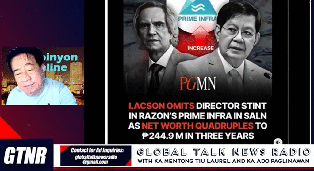 The discussion, featuring former diplomat Ado Paglinawan, centered on the political and legal crisis surrounding the potential surrender of Senator Ronald “Bato” dela Rosa to the International Criminal Court (ICC), directly challenging Senator Ping Lacson’s opinion on constitutional immunity by arguing that such protection from arrest applies only within Philippine jurisdiction and is invalid against international bodies like the ICC—a point underscored by the Philippines’ departure from the Court in 2019; this constitutional debate was framed within the broadcast’s broader narrative of systemic corruption, which included strong allegations of graft within the administration and its ties to business oligarchs, a theme sharply personalized by a specific accusation against Senator Risa Hontiveros for allegedly failing to declare a directorship in a company owned by billionaire Enrique Razon, an omission linked to claims that her net worth suspiciously quadrupled from ₱60 million to nearly ₱250 million in three years, suggesting a profound conflict of interest.
