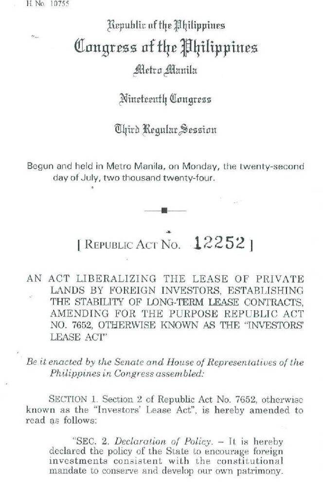 Ang Republic Act No. 12252, na kilala rin bilang “An Act Liberalizing the Lease of Private Lands by Foreign Investors,” ay nagsusog sa Republic Act No. 7652 o ang “Investors’ Lease Act.” Layunin ng batas na gawing mas “flexible at dynamic” ang patakaran ng bansa sa pagpapaupa ng lupa sa mga dayuhang negosyante.
