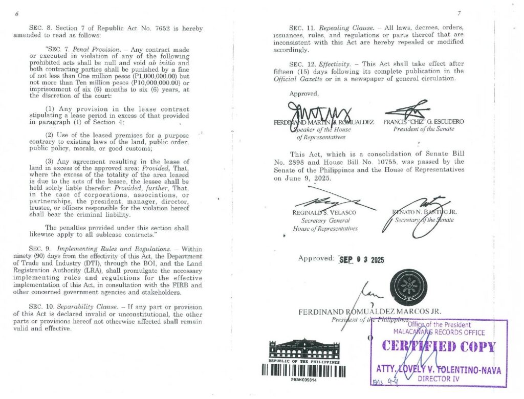 Isang makasaysayang batas ang pinirmahan ni Pangulong Ferdinand Romuáldez Marcos Jr. noong Setyembre 3, 2025, na naglalayong higit na mag-akit ng mga dayuhang pamumuhunan sa bansa sa pamamagitan ng pagpapalawig at pagpapatatag ng mga long-term lease o pangmatagalang pagpapaupa ng pribadong lupa.