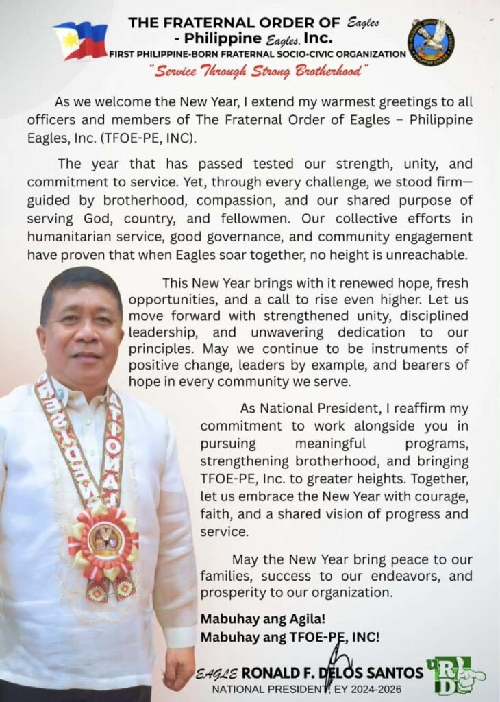 As the calendar turns, The Fraternal Order of Eagles – Philippine Eagles, Inc. (TFOE-PE, Inc.) enters the new year not just with celebration, but with a renewed sense of mission, brotherhood, and service to the nation. In his heartfelt New Year’s address, National President Ronald F. Delos Santos called upon every member to embrace the coming months with courage, faith, and a shared vision of progress.